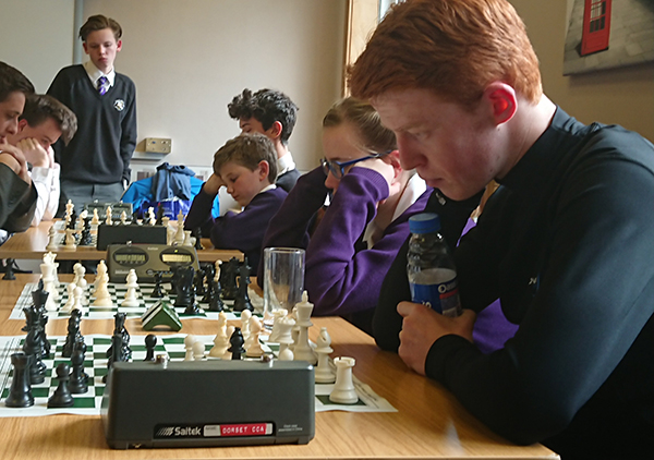Thomas won his first game on board three but was under a lot of stress after losing his second, concentrating so hard that his breathing was audible in an otherwise silent room. However he recovered his third game from being an exchange down, by a pin and then a fork, leading to the win which secured Highcliffe’s overall victory – and an enormous sigh of relief from Thomas.