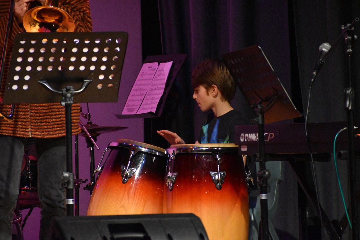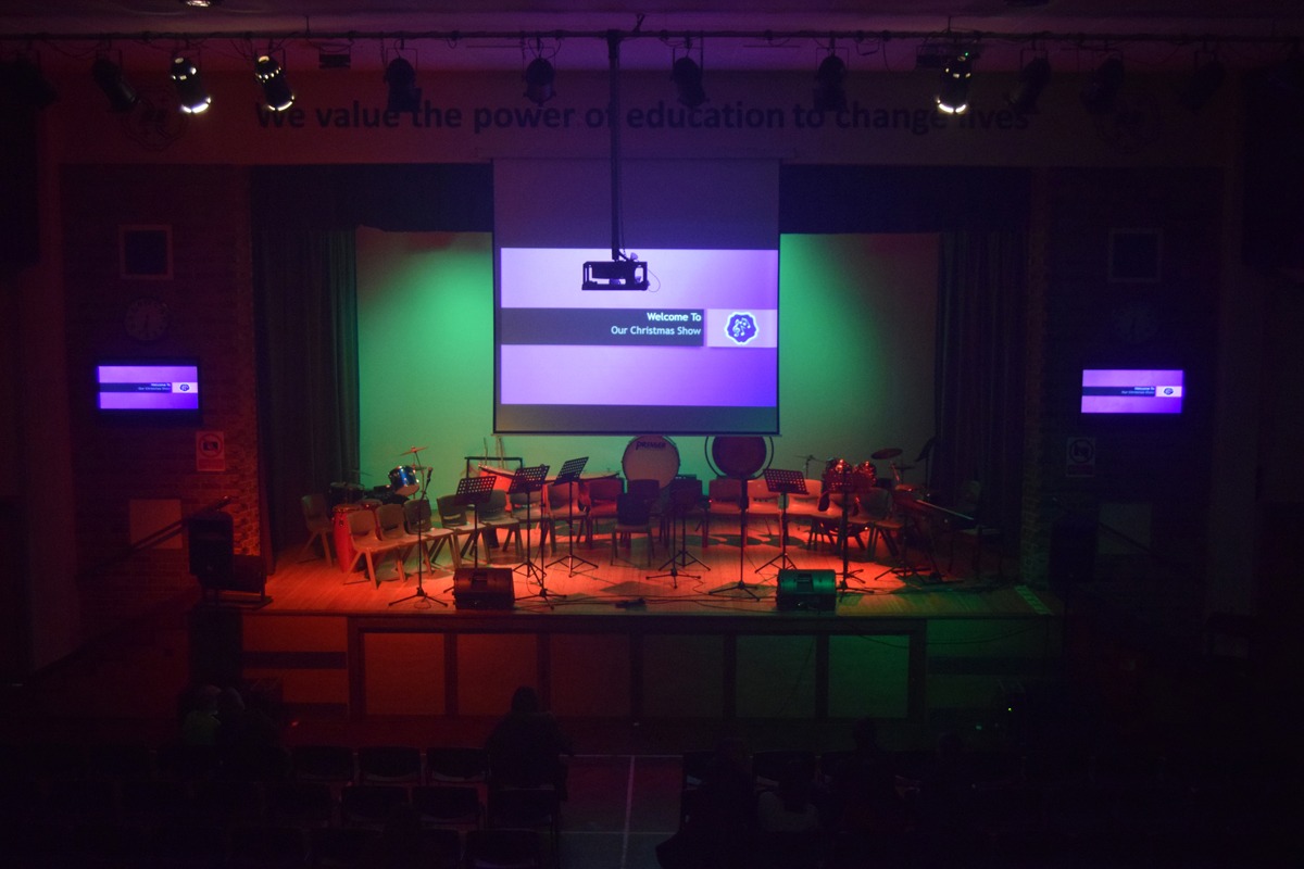 Both evenings began with the whole-school Percussion Ensemble led by Simon Mellish and grown now to include two drum kits, timpani, congas, djembes, bass drum, gong and an array of hand percussion. Various audition items that the students themselves arranged and rehearsed ranging from vocal four-part harmony to loud rock interspersed the larger ensembles. The latter included the usual performances from the Ukulele Orchestra and the Guitar Ensemble who combined for Mark Potter’s arrangement of Carol of the Bells. The two school choirs performed at their best with the Main School choir being rehearsed and led by two of our GCSE students.